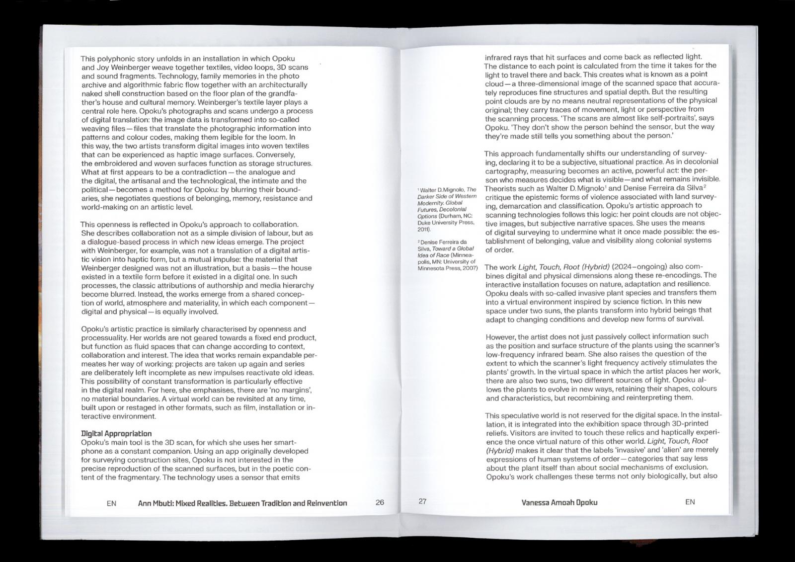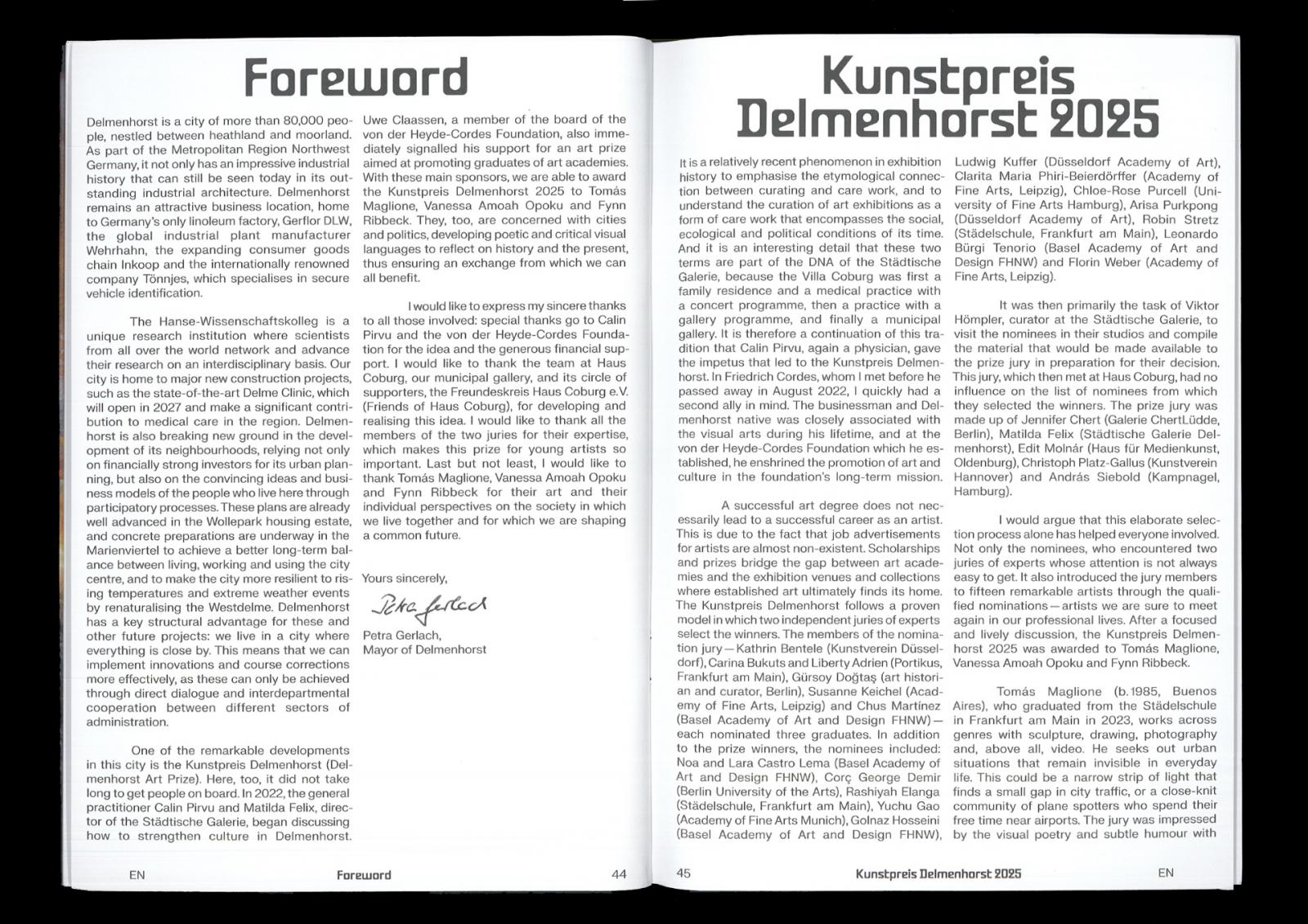 Die Publikation erschien im Jahr 2025 im Rahmen der Ausstellung Kunstpreis Delmenhorst 2025. Tomás Maglione, Vanessa Amoah Opoku, Fynn Ribbeck.