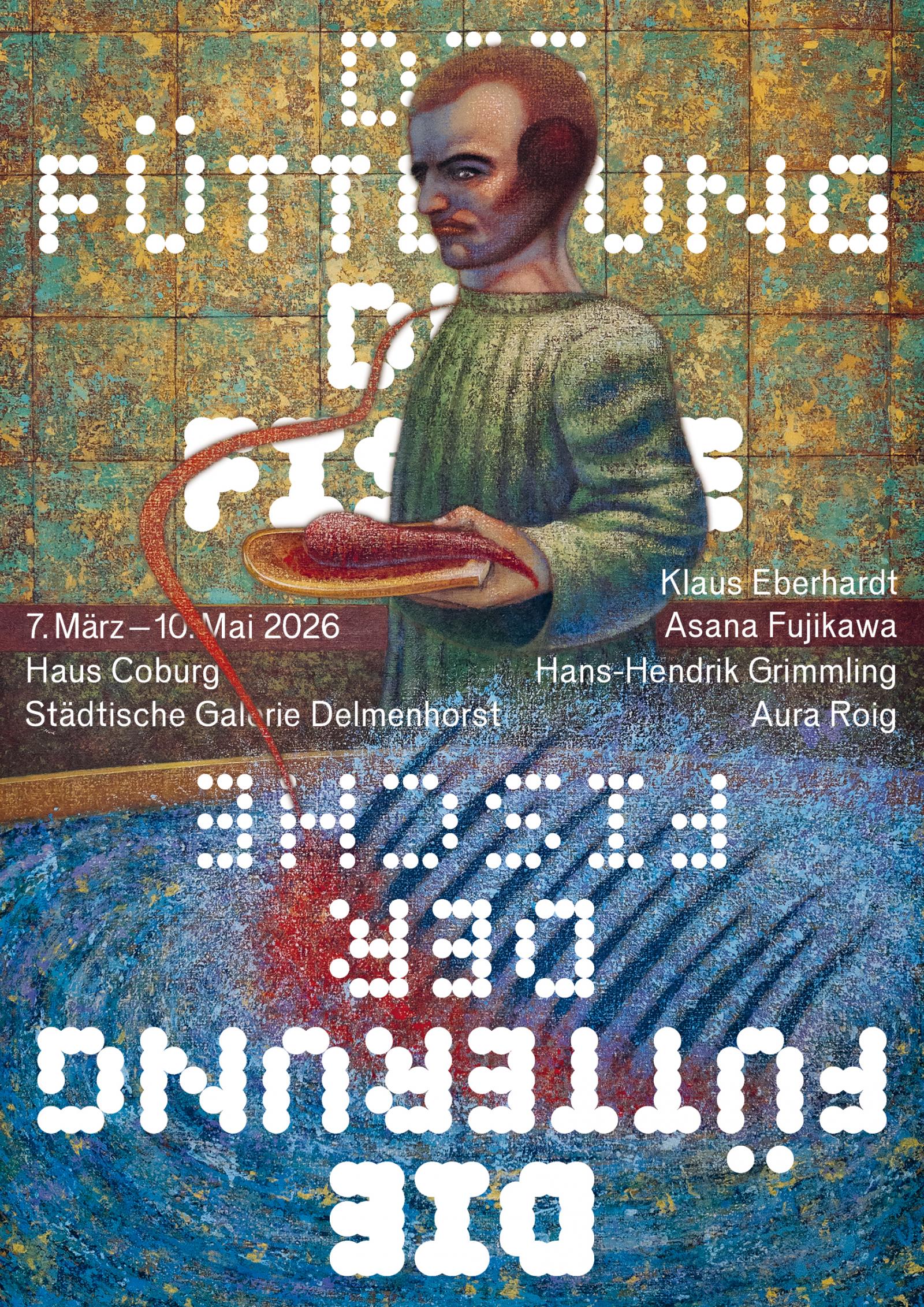 Die Bilder von Klaus Eberhardt treffen im Haus Coburg auf Künstler:innen, die in ihren Werken eine autofiktionale Figuration verfolgen und Gefährdungen thematisieren, ohne sie auszubuchstabieren. Asana Fujikawa (*1981 in Tokio) entwickelt in druckgrafischen Folgen märchenhafte Narrationen, deren Protagonisten sie anschließend in Keramik ausformt. So entstehen filigrane Gestalten, die einen dissoziativen Zustand von An- und Abwesenheit kultivieren. Hans-Hendrik Grimmling (*1947 in Zwenkau) ringt in seinen Gemälden um Freiraum. Körperglieder, Vögel und Pflanzen sind wiederkehrende Motive, mit denen er metaphorisch gegen einengende und repressive Strukturen vorgeht. Aura Roig (*1994 in Tortosa) verbindet in ihrer Malerei persönliche Erfahrungen und universelle Ideen zu einem magischen Realismus. Vor allem die Familie als Ort der Fürsorge und der repressiven Traditionsweitergabe kontrastiert sie in ihren Werken mit Humor.